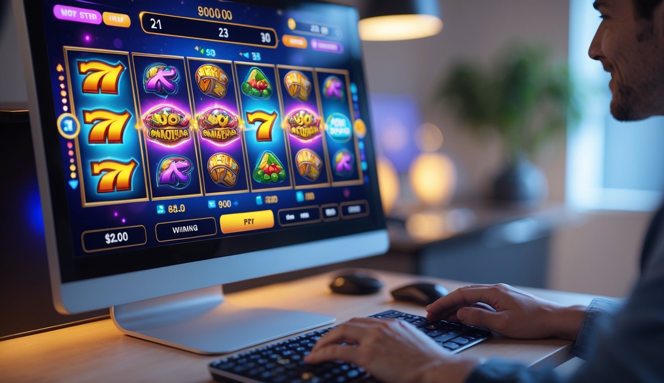 Tangan seseorang sedang bermain permainan slot online di komputer dengan layar menampilkan grafik permainan yang berwarna-warni.